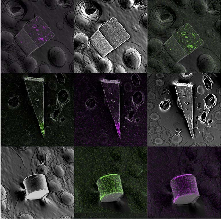 We performed SEM-EDS in order to identify the presence of the phototherapeutic agent in our microstructures. This phototherapeutic agent is MoS2 nanosheets and by performing SEM-EDS we can identify the molybdenum (Mo, in green) and the sulfur (S, in pink) content. The identified presence of the phototherapeutic agent (MoS2) in the microstructures confirms the ability of this system to be used for local and controlled drug delivery utilizing a switch on-off mechanism (upon near-infrared laser irradiation) for drug release, while it can also contribute to tumor thermal ablation.