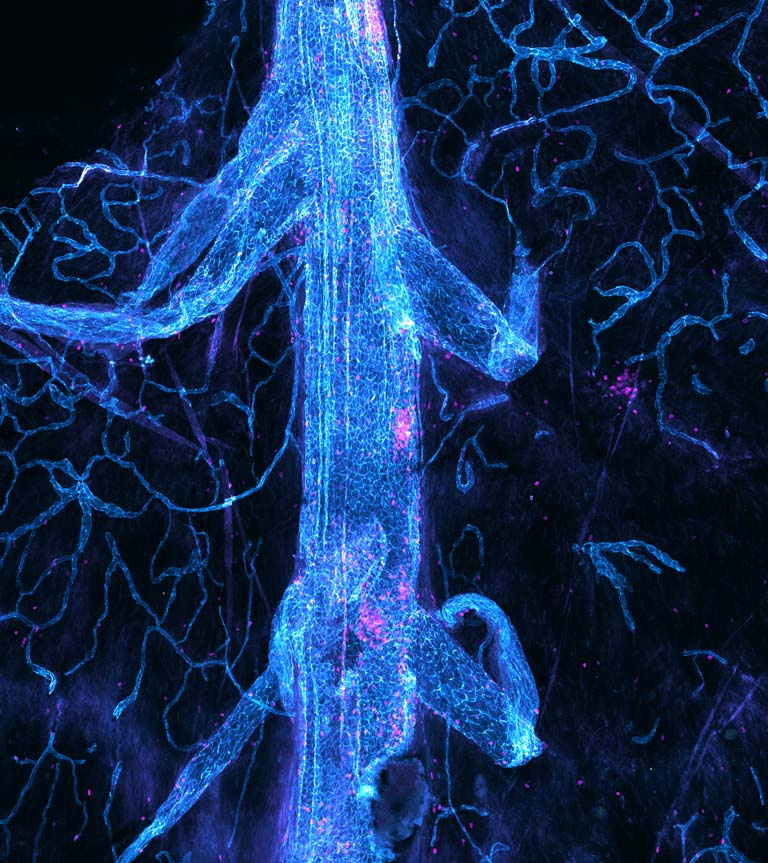 The meninges are a leathery tissue that surround the brain. For decades, pathologists have discarded the meninges as they studied brain anatomy. New evidence from our lab and others suggests that the meninges harbor an astonishing diversity of cells that play a critical role in brain disorders including glioblastoma and Alzheimer’s Disease. These images depict the meninges from a mouse. You can see blood vessels, lymphatic vessels, macrophages (cyan cells in mm1, mm3, and mm4), and even T cells (magenta cells in mm2). Meningeal macrophages actively sense molecules from the brain via cerebrospinal fluid, and other meningeal cells such as T cells—amazingly—secrete substances that enter the brain and modulate neurons, such as specialized interneurons expressing vasoactive intestinal peptide (mm5).