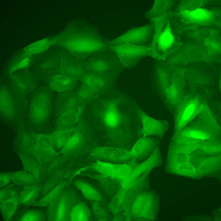 This picture shows cancer cells after being treated with a chemotherapy drug. Using these images, I am able to link how these cells are processing outside information during chemo treatment with what type of cancer cell they will eventually turn into days later.