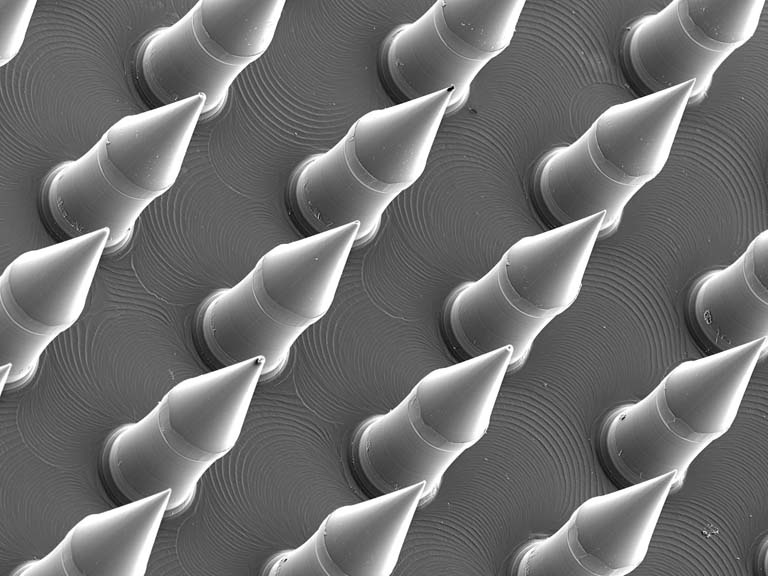 This image shows the first ever microneedle platform capable of stabilizing COVID vaccines (but also other complex vaccines) with ultra-long shelf-life, solving one of the most challenging aspects of COVID vaccination, namely, cold chain and low stability at room temperature. The image shows excellent fidelity and microstructure of the fabricated microneedle loaded with COVID vaccines for injection-free vaccination.