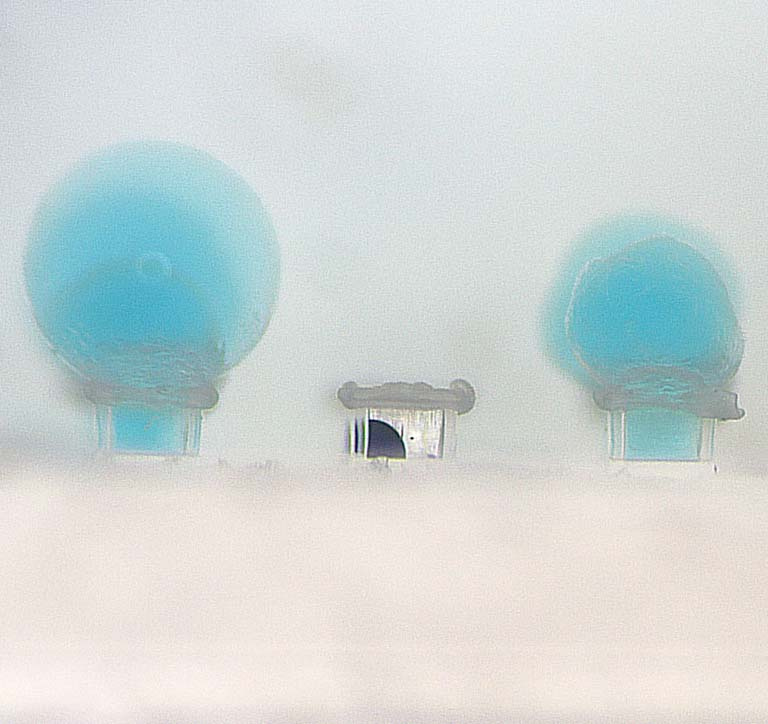 This image is taken from a frame of a video allowing for real-time monitoring of our fillable polymer microparticles (FPM). Two conditions were tested in this image (in an alternating format of condition A, condition B, condition A etc.) to demonstrate the varying release times of these FPMs depending on the contents inside of the core.