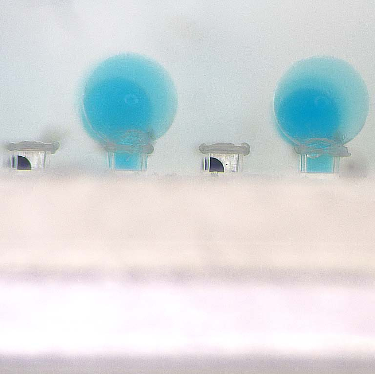 This image is taken from a frame of a video allowing for real-time monitoring of our fillable polymer microparticles (FPM). Two conditions were tested in this image (in an alternating format of condition A, condition B, condition A etc.) to demonstrate the varying release times of these FPMs depending on the contents inside of the core.