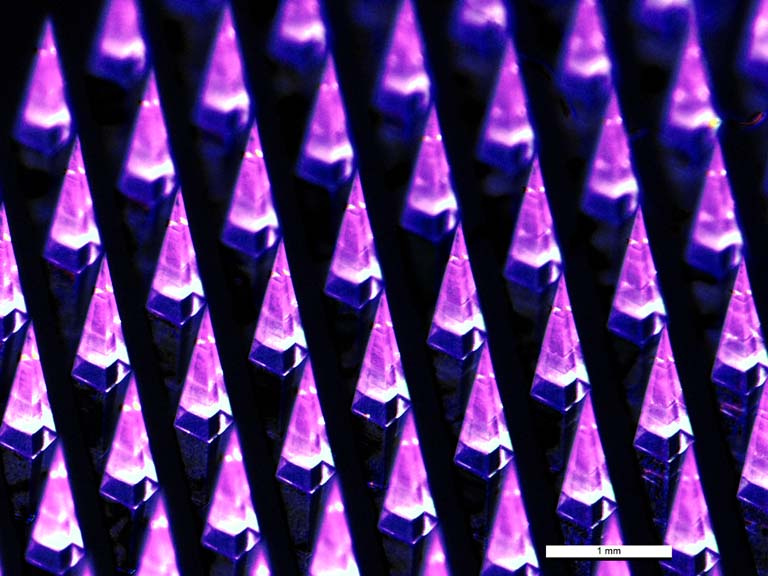 In this image we can see microscopic pyramid-shaped needles produced by a 3D-printer at MIT.nano capable of creating discrete objects in the order of several hundred nanometers to tens of microns with extremely high precision. The needles are printed on a Silicon chip, a highly reflective glass-like material that increases the adhesion between the needles and the surface on which they are printed on.