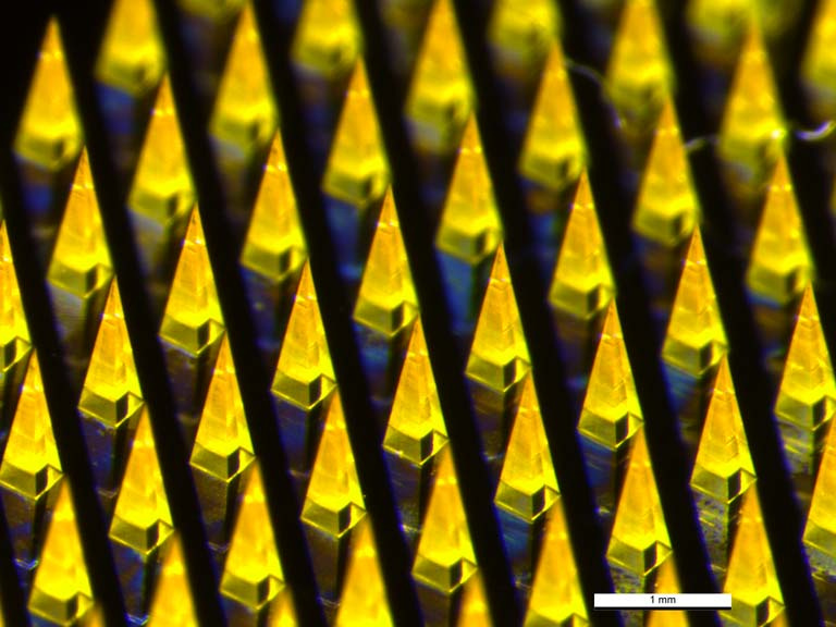 In this image we can see microscopic pyramid-shaped needles produced by a 3D-printer at MIT.nano capable of creating discrete objects in the order of several hundred nanometers to tens of microns with extremely high precision. The needles are printed on a Silicon chip, a highly reflective glass-like material that increases the adhesion between the needles and the surface on which they are printed on.