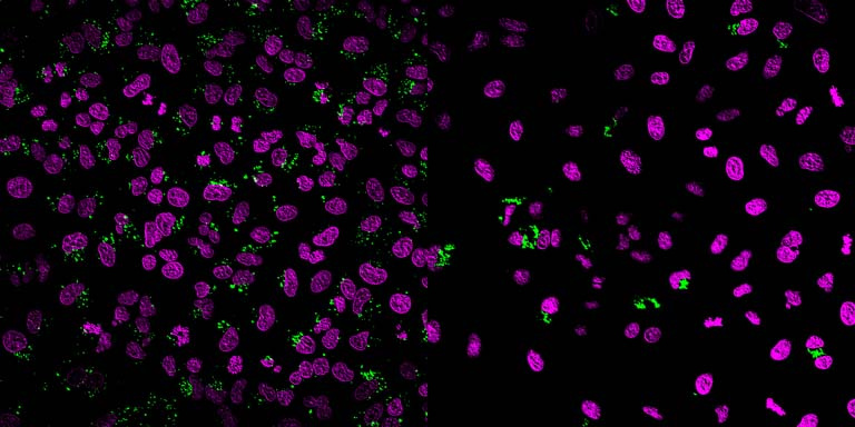 We are developing a strategy to get proteins directly into cells, which would be very useful for gene therapy and other kinds of new medical applications. For this strategy, we attach molecules called cell-penetrating peptides to proteins, and the peptides help the protein enter into cells. Once the complex successfully enters the cell, the peptides fall off of the protein and the protein can perform its function. Here, to test the ability to get proteins into cells we attached cell-penetrating peptides to a fluorescently tagged protein. We wanted to check whether the protein actually entered inside the cells, and this microscopy experiment showed that it did.