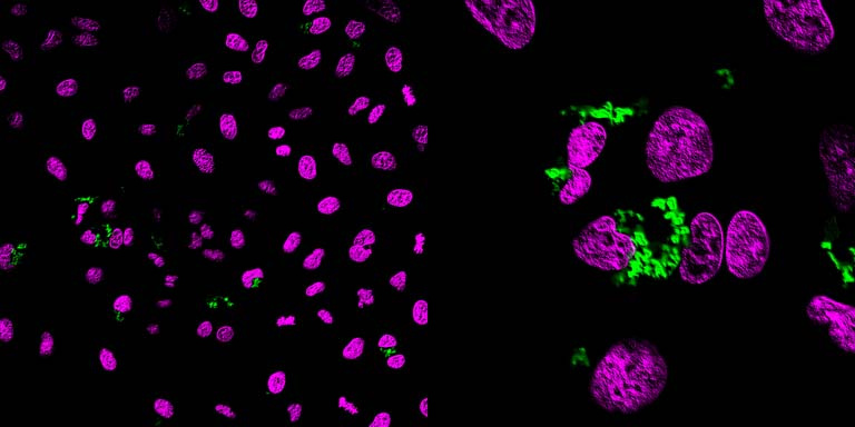 We are developing a strategy to get proteins directly into cells, which would be very useful for gene therapy and other kinds of new medical applications. For this strategy, we attach molecules called cell-penetrating peptides to proteins, and the peptides help the protein enter into cells. Once the complex successfully enters the cell, the peptides fall off of the protein and the protein can perform its function. Here, to test the ability to get proteins into cells we attached cell-penetrating peptides to a fluorescently tagged protein. We wanted to check whether the protein actually entered inside the cells, and this microscopy experiment showed that it did.