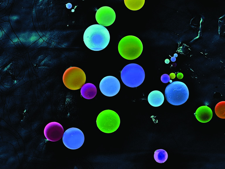 The subject of the images is the microparticles fabricated by a novel, biodegradable natural product-based polymer material.