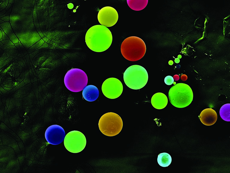 The subject of the images is the microparticles fabricated by a novel, biodegradable natural product-based polymer material.