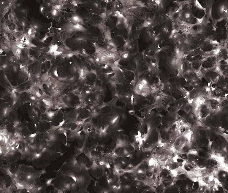 These images show cancer cells in the process of adapting to a new growth format, which will enable us to understand how cancer cells alter their metabolic behavior to survive in different environments. These images were of cancer cells that had been grown in 3D matrices previously and were transferred to a 2D growth format where they exhibit dramatic alterations and a high degree of variability, which we were documenting.