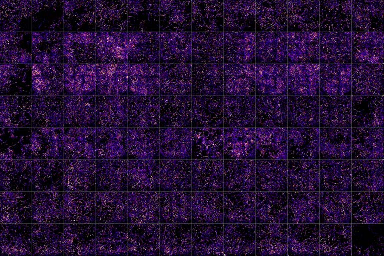This is a large scale experiment to find molecules that increase or decrease cancer growth. We measure each molecule’s activity by taking an image of cells grown in culture (here, cells taken from a desmoid tumor, a rare type of cancer). Based on how densely the cells are growing (here, visualized as a gradient from purple to yellow), we can assess the activity of each molecule. Such microscopy-based workflows enable these large scale screening experiments in many more cancers than other traditional methods.