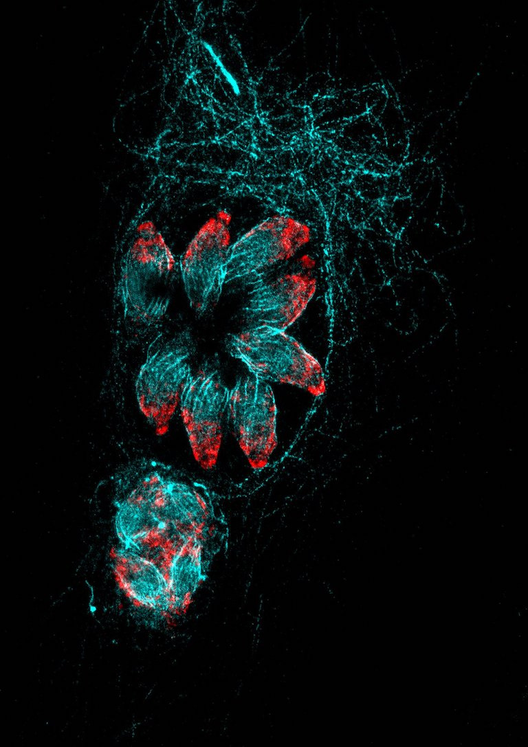 Depicted here is a super resolution image of eight Toxoplasma gondii parasites replicating inside of an infected human cell. We’ve specifically labeled and detected two components in these cells: (1) the cellular skeleton of the parasite and its host called microtubules (colored in cyan) and (2) membrane-bound vesicles at the tip of each parasite called micronemes that carry a payload of proteins critical for infection (colored in red). When the parasite is done replicating within a host cell and ready to leave, it coordinates its cellular skeleton with these vesicles to unleash an array of proteins that destroys the host cell and launches the parasite out for it to find a new cell to invade and repeat the process. If the infection is left unchecked, the parasite can cause rapid tissue destruction throughout the body. Understanding how the parasite coordinates these two highlighted components can reveal new vulnerabilities of this group of life-threatening pathogens.