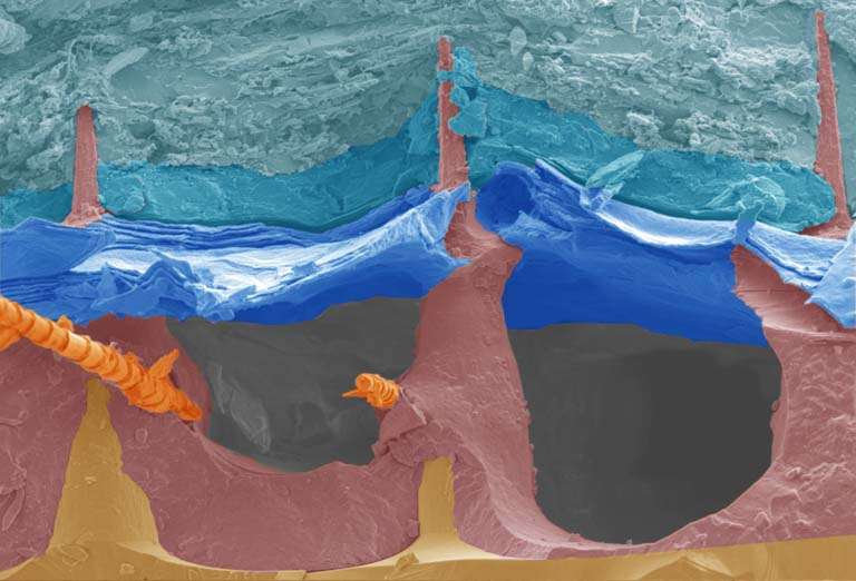 Rapid and widespread administration of vaccines is critical when responding to pandemics like the recent COVID-19 pandemic. Microneedles provide a way for vaccines to be self-administered by patients in a pain-free manner ideal for this purpose. This false colored cryogenic scanning electron micrograph shows a solid layer of vaccine (in brown) coated onto an array of microneedles (gold) which are barely visible to the naked eye (hundreds of micrometers in length). Hundreds of these microneedles form a vaccine coated ‘patch’ which can be used to deliver vaccine minimally invasively to accessible body ‘surfaces’ such as the skin or more recently to gastrointestinal mucosa (buccal, stomach, intestines) by orally ingestible devices developed in the Traverso and Langer Labs. Vaccine coatings dissolve when inserted in tissue. Delivery of vaccine to mucosal surfaces may also provide better mucosal immune responses which may limit breakthrough infection and the transmission of viruses in vaccinated individuals.