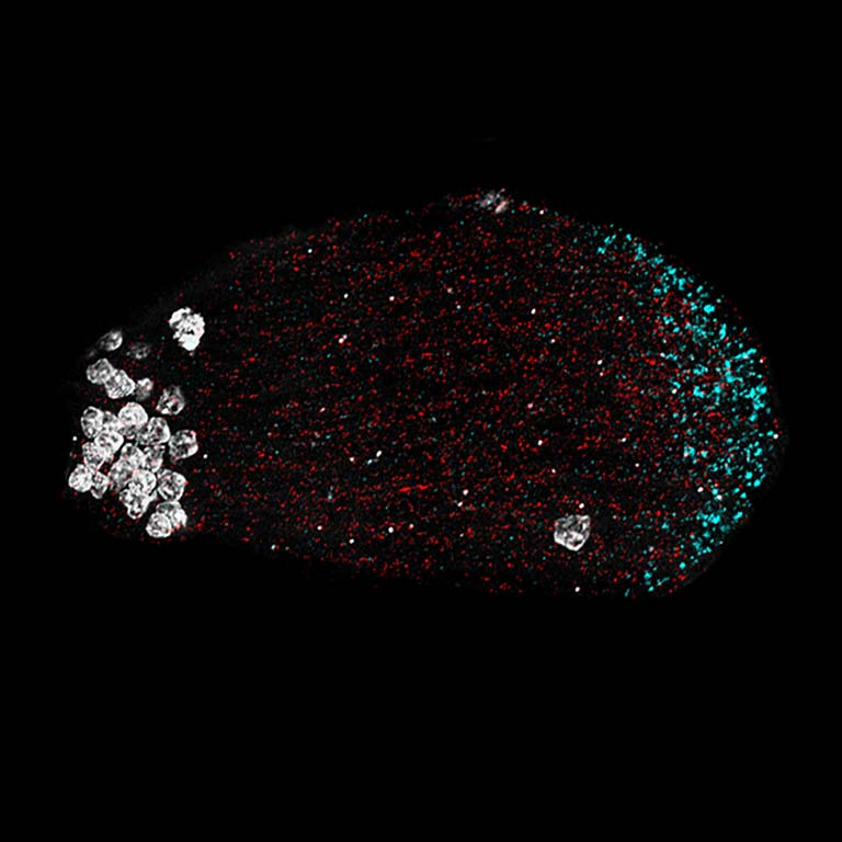 Drosophila produce some of the largest sperm in the animal kingdom with a mature sperm measuring almost 2mm in length (human sperm are 50um). Cells, especially very large cells, can benefit from localizing cellular components to specific regions of the cell where they are needed. Drosophila sperm do not synthesize new mRNA (the instructions for making the proteins needed for cellular function) and instead store mRNAs from earlier in development for use during sperm maturation. This image shows a cyst of spermatids that have started the process of elongating. The nuclei are at one end of the cyst (white) and the sperm tails are elongating at the other end of the cyst. The red and cyan show two different types of mRNAs – the red one is diffuse throughout the cyst while the cyan one is polarized at one end. This polarization of specific mRNAs is critical for proper sperm development with mis-localization resulting in sterility.