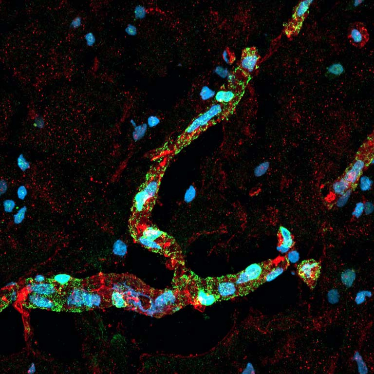 Several of the images are showing novel markers for cell types that comprise the human brain vasculature and others use viral techniques to label the blood vessels or associated cells in the mouse brain vasculature. With this profiling completed and published, we are now utilizing the large datasets generated to develop therapeutic strategies for targeting the brain vasculature to repair and possibly improve neurodegenerative phenotypes in Huntington’s disease.