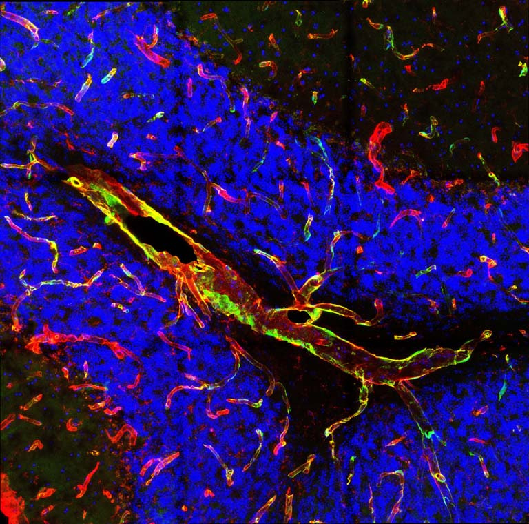 Several of the images are showing novel markers for cell types that comprise the human brain vasculature and others use viral techniques to label the blood vessels or associated cells in the mouse brain vasculature. With this profiling completed and published, we are now utilizing the large datasets generated to develop therapeutic strategies for targeting the brain vasculature to repair and possibly improve neurodegenerative phenotypes in Huntington’s disease.