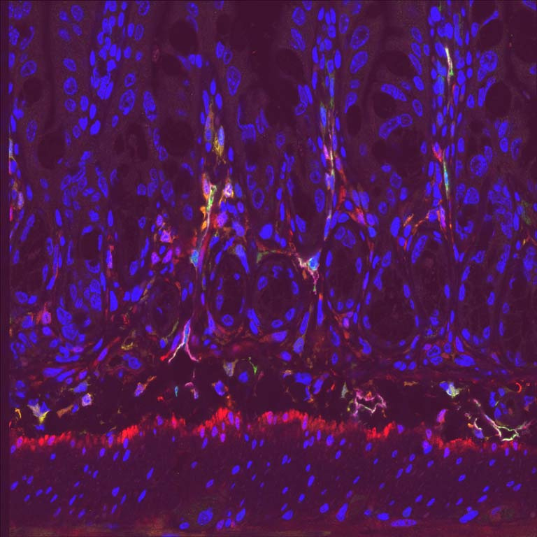 Regeneration of intestinal epithelial cells requires their surrounding niche cells in the stroma. This image visualizes two important stromal niche cells that produce R-spondin3 (RSPO3). These cells are lymphatic endothelial cells and RSPO3+GREM1+ fibroblasts. These cells expand and produce more RSPO3 to support post-injury regeneration of the intestine.