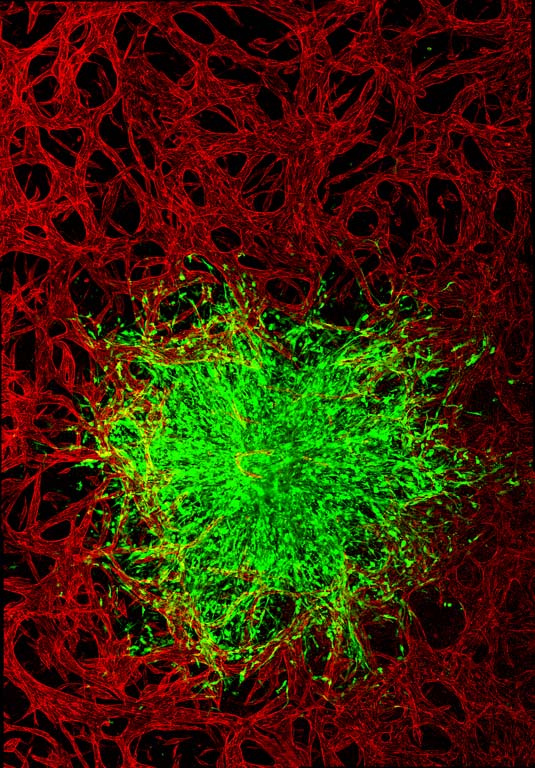 This image shows a small-scale device that incorporates human cells of the brain. Endothelial cells that form blood vessels are mixed with supporting cells of the brain tissue (pericytes and astrocytes). A brain tumor (glioblastoma) spheroid is shown in the center of the device. All cells are mixed on day 0 and following 7 days of culture, endothelial cells form blood vessels (shown in red) surrounding and adjacent to the brain tumor spheroid.