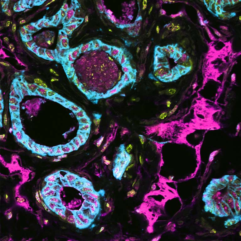 More than 90% of all cancer-related deaths are caused by metastasis, the spread of cancer to a different part of the body than where it started. In this image, we capture disseminated colorectal cancer (CRC) invading the liver, the primary metastatic organ of this tumor type. To invade into their destination organ, cancer cells utilize a class of enzymes, called proteases. We stain the cancer cells (the wave-like granular structures in Cyan, characteristic of intestinal epithelial cells) and the dysregulated proteases (in magenta, red & yellow) in a liver tissue section, to highlight the tumor’s ‘weapons’ of choice during liver invasion. Our overarching research goal is to leverage locally expressed, dysregulated protease activity to develop precision diagnostics and therapeutics for cancer metastasis.
