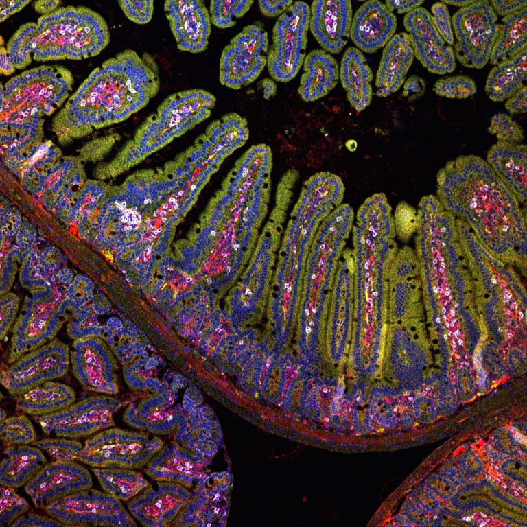 The presence of chromosome gains or losses in a cell, known as aneuploidy, is a frequent feature of human cancers. Despite this prevalence, little is known about how the immune system interacts with aneuploid cells within complex living systems. Jacks Lab researchers use a mouse model with high levels of aneuploidy in the small intestine (seen here) to investigate how the cells of the immune system respond to chromosomal imbalances.