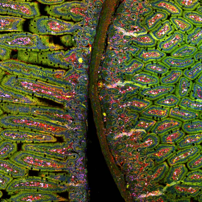 The presence of chromosome gains or losses in a cell, known as aneuploidy, is a frequent feature of human cancers. Despite this prevalence, little is known about how the immune system interacts with aneuploid cells within complex living systems. Jacks Lab researchers use a mouse model with high levels of aneuploidy in the small intestine (seen here) to investigate how the cells of the immune system respond to chromosomal imbalances.