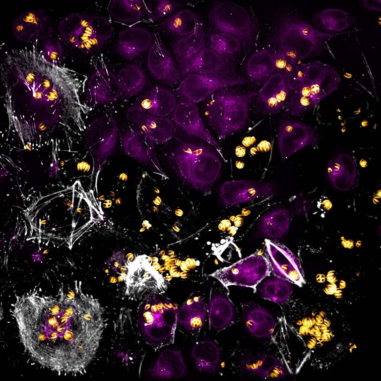 The pathogen Toxoplasma gondii is an infamous parasite that infects a quarter of the global population. The images included here show the course of an infection. “We grow together 1” and “we grow together 2” show surprising examples of parasites hitchhiking with their hosts during host division. “We grow together 3” shows the once-miniscule parasite communities now grown to the size of host cell nuclei. Near the center of the image, one ball of parasites has ruptured its sanctuary cell in search of more fertile grounds. The final image in the series, “We grow together 4”, shows a layer of heavily infected host cells in crisis. The parasites have begun exiting the cells en masse, tearing them apart in the process. Such extensive host cell lysis gives rise to the pathology of the infection.