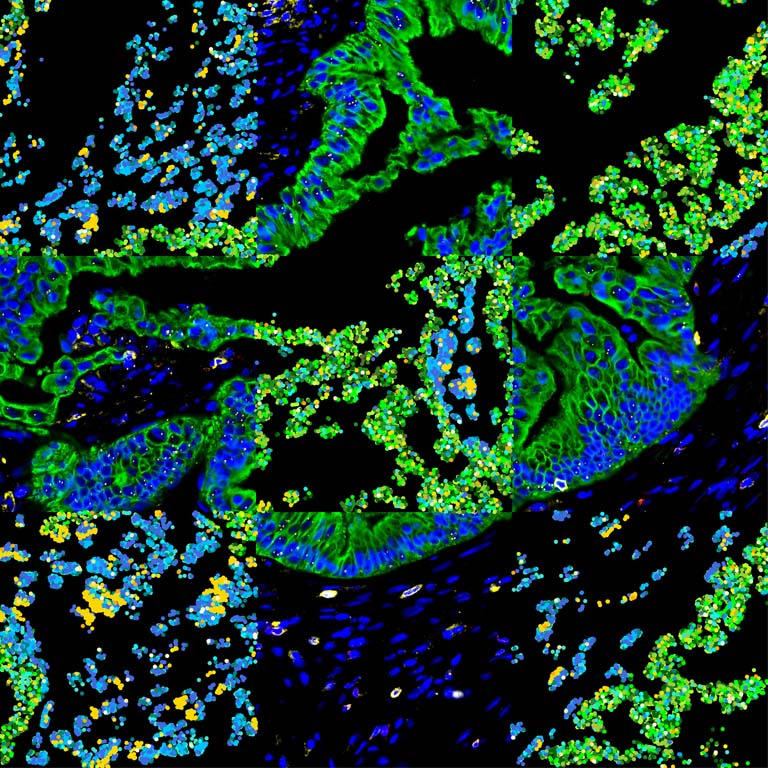 We performed high-resolution, multi-modality imaging of proteins (immunofluorescence) and messenger RNA transcripts (spatial transcriptomics) in a slice of human pancreatic cancer with each modality displayed in alternating squares. For protein squares, cancer cells are stained in green, immune cells in yellow/red, and other cell types in the tumor microenvironment are blue. For messenger RNA squares, a subset of RNA transcripts (out of approximately 1000 different genes detected) that are localized with micron precision are displayed as colored dots. Canonical marker genes for cancer cells are shown in shades of green and immune cells are shown in shades of yellow. Housekeeping genes are displayed in shades of blue. The fact that the messenger RNA squares largely maintain and recapitulate the architecture of the tumor microenvironment in a cell-type specific manner as defined by the protein squares suggests that the spatial transcriptomics method has high specificity.