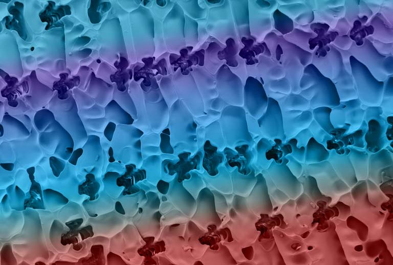 Cultivating densely packed cells is crucial in trying to engineer ‘living’ implants, such as lab-grown tissue for replacing a patient’s damaged organ. However, when cells get too cramped, they will eventually need to compete for nutrients such as oxygen and end up suffocating each other. Pictured here is a new type of porous material that features many microscopic pores that are just the right size for cells to live comfortably inside of. The other key property of this material is that the network of solid walls exhibits rapid transport of oxygen. As a result, oxygen can be efficiently distributed to a greater number of cells throughout the entire structure. In other words, this engineered material offers cells a high-capacity tenement building with a modern central air system! I took this image to inspect the microscale structure of the material.