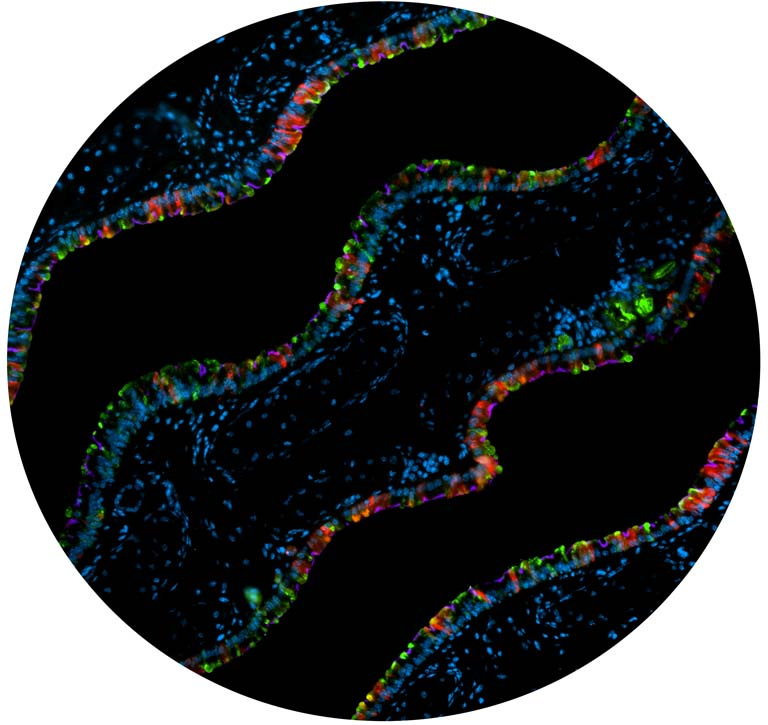 We are developing gene therapy for the lung, which could treat diseases ranging from lung cancer to asthma. The major limiting factor for lung gene therapy has been the ability to deliver a gene into cells without causing toxicity. Here, we used lipid nanoparticles (LNPs) invented in our lab to deliver a gene that causes cells to turn red, to test how effective our LNPs were. We found very good delivery to a wide variety of lung cells, including important lung cell types such as club cells (green) and ciliated cells (purple border).