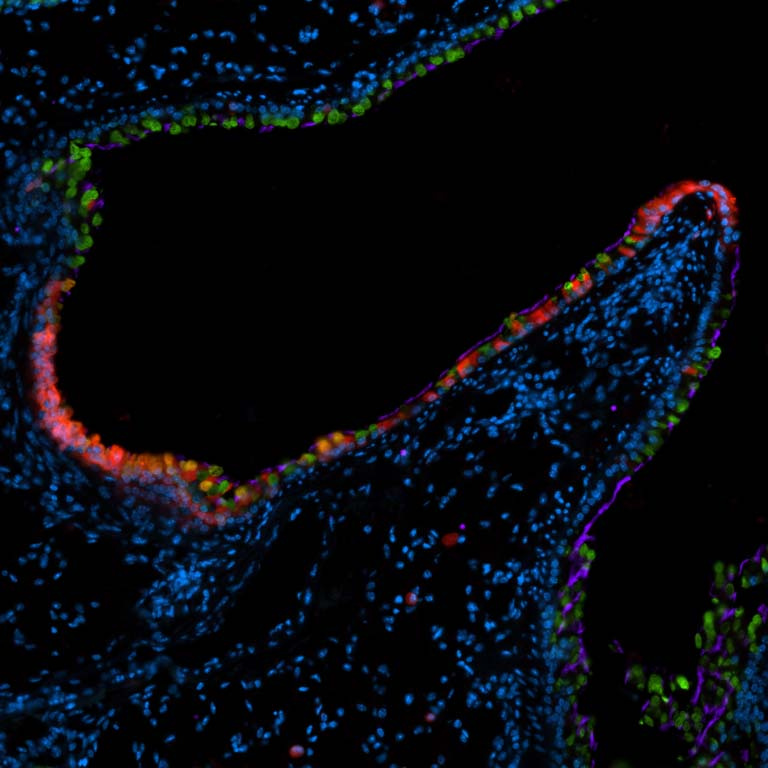 We are developing gene therapy for the lung, which could treat diseases ranging from lung cancer to asthma. The major limiting factor for lung gene therapy has been the ability to deliver a gene into cells without causing toxicity. Here, we used lipid nanoparticles (LNPs) invented in our lab to deliver a gene that causes cells to turn red, to test how effective our LNPs were. We found very good delivery to a wide variety of lung cells, including important lung cell types such as club cells (green) and ciliated cells (purple border).