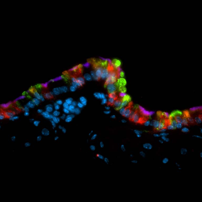We are developing gene therapy for the lung, which could treat diseases ranging from lung cancer to asthma. The major limiting factor for lung gene therapy has been the ability to deliver a gene into cells without causing toxicity. Here, we used lipid nanoparticles (LNPs) invented in our lab to deliver a gene that causes cells to turn red, to test how effective our LNPs were. We found very good delivery to a wide variety of lung cells, including important lung cell types such as club cells (green) and ciliated cells (purple border).
