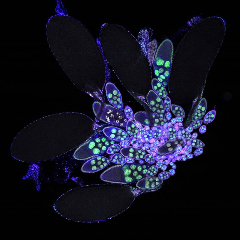 This image shows a flattened adult ovary of a fruit fly, consisting of germ cells at different stages of development. It looks like an assembly chain of a factory. The induvial compartments are called egg chambers, and different sizes indicate different development stages. The biggest compartments are developed eggs.