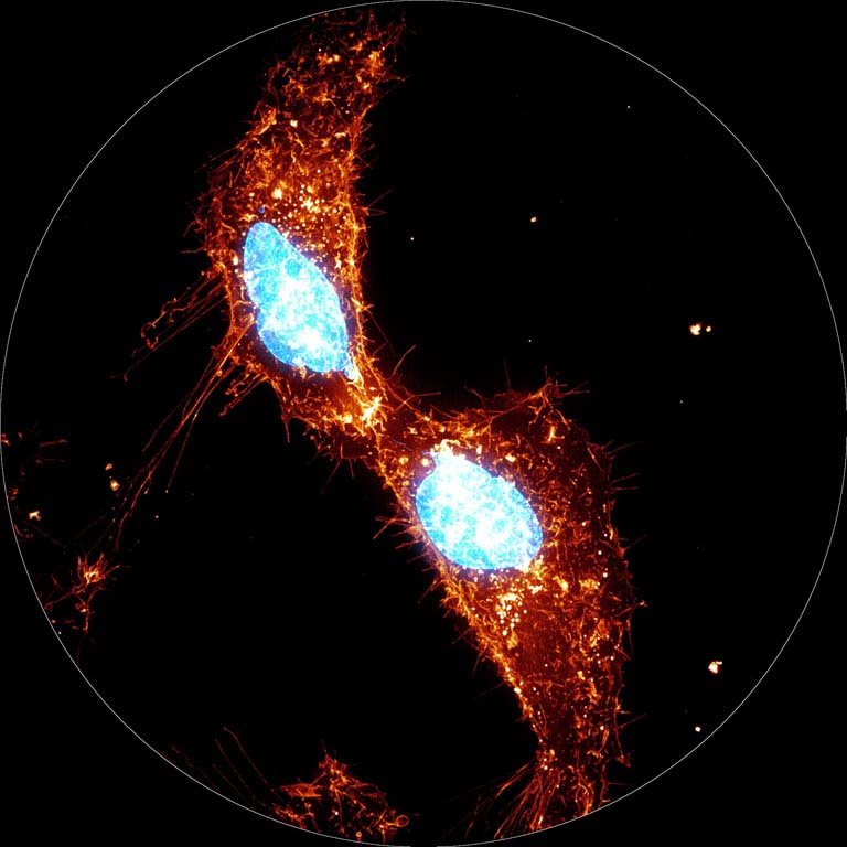 Work in the Koch Institute, led by Dr Miettinen and Prof Manalis, has investigated the dynamics of the cell’s outer membrane, also known as plasma membrane, during cell division. The image displays two live human adenocarcinoma sister cells, which have just divided from a mother cell. The plasma membrane of the cells is labelled with red and yellow colors. Many membrane protrusions can be seen that help the cell attach and move around its environment. The shown sister cells are still connected to each other through a thin intercellular bridge, within which a narrow strand of DNA, labelled in blue, can be seen. This DNA strand is known as a chromatin bridge, and it represents the cell’s failure to segregate the DNA between the daughter cells normally. Such chromatin bridges can result in DNA breakage and mutations that drive cancer. By understanding how the plasma membrane movement is regulated during cell division, the researchers hope to explain how such cell division errors arise and how they can be corrected.