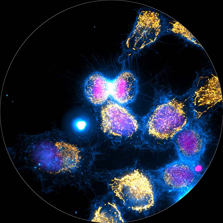 Work in the Koch Institute and the MIT Center for Precision Cancer Medicine, led by researchers in the Vander Heiden and Manalis labs, has revealed that cells are in a metabolically different state during cell division. The image displays live human adenocarcinoma cells, some of which are in the process of cell division, where the cell rounds up prior to the separation of the daughter cells. Mitochondria, shown in yellow, are key metabolic organelles that display altered metabolism during cell division. By discovering how these metabolic changes are regulated, the researchers aim to understand how the division of the cell’s DNA, shown in magenta, and the rest of the cell, shown in blue, is regulated.