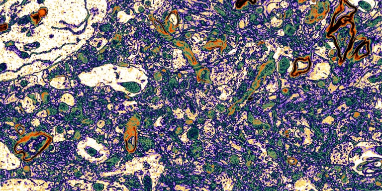 While much is known about processes linked to neurodegeneration in Huntington’s disease, few insights exist for how pathological phenotypes impact organelle structure and function in neural tissue. The Housman Lab uses electron microscopy driven by the expertise and cutting-edge resources of the Nanotechnology Core Facility to visualize and quantify ultrastructural signatures of disease in HD model systems such as the mouse model shown in this image. We aim to learn which organelle structures are the most disrupted in HD. With these signatures, we hope to evaluate if the treatments we are currently developing using human genetics can reverse structural abnormalities present in the HD brain. Colors are added for an artistic effect.