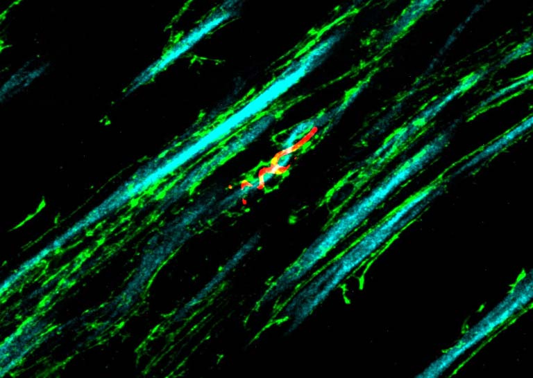 This image shows 800-times-magnified views of a helical amyloid-beta nanostructure (in color magenta) spirally tangling around a bundle of axons (in color cyan) in an Alzheimer’s Disease (AD) mouse model 5xFAD. Interestingly, clusters of sodium ion channels (in yellow) were found co-localizing with these distinct amyloid-beta nanostructures, suggesting intriguing functional relationships between these proteins and potential functional consequences.