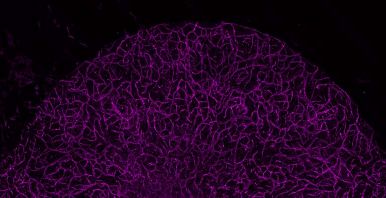 My images demonstrate a human stem-cell derived blood-brain barrier (BBB) model that will be critical for us to study this biological barrier in the context of fundamental neuroscience, diseases such as Alzheimer’s, and drug discovery and testing of treatment strategies that cross and function within the brain itself. [This particular image] shows a human induced pluripotent stem cell (iPSC)-derived BBB that has self-assembled into 3D vascularized networks within our custom-fabricated microfluidic chips within an engineered hydrogel that can support longer-term cell culture.