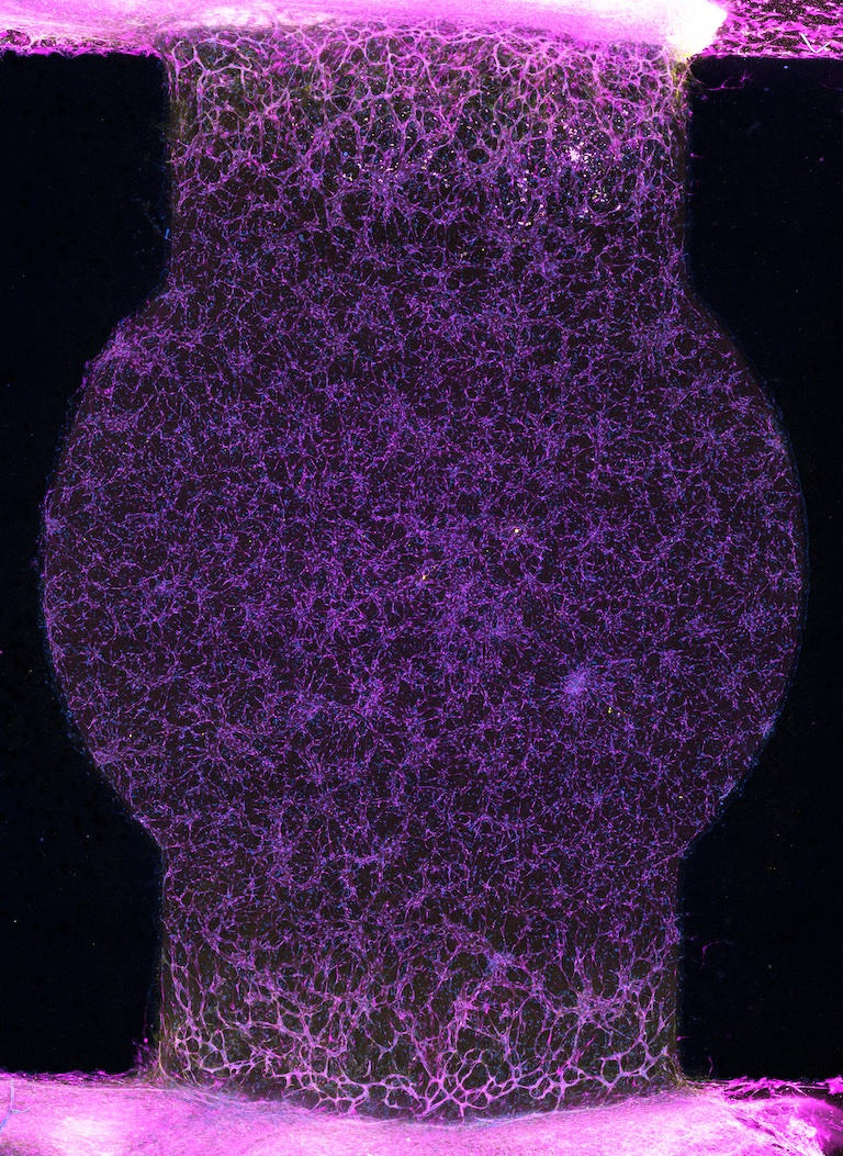 My images demonstrate a human stem-cell derived blood-brain barrier (BBB) model that will be critical for us to study this biological barrier in the context of fundamental neuroscience, diseases such as Alzheimer’s, and drug discovery and testing of treatment strategies that cross and function within the brain itself. [This particular image] shows a human induced pluripotent stem cell (iPSC)-derived BBB that has self-assembled into 3D vascularized networks within our custom-fabricated microfluidic chips within an engineered hydrogel that can support longer-term cell culture.