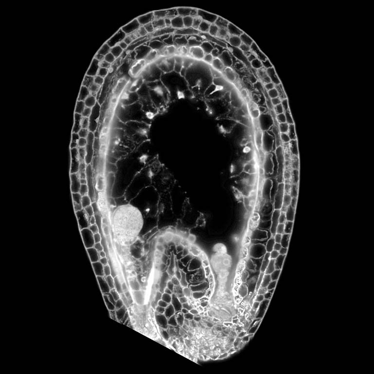 Confocal microscopy can be used to peer inside of whole seeds, letting us appreciate the hidden complexity of tissue types and cell behaviors. Multiple layers of seed coat cells enclose two distinct offspring in this seed of Arabidopsis thaliana (thale cress). On the left, a globular embryo is rooted to the seed coat with a line of cells called the suspensor. The rest of the seed interior is made of endosperm – a sibling to the embryo that mediates developmental and nutritional dynamics inside of flowering plant seeds. While the endosperm is ephemeral and does not persist past seed germination, it has a unique developmental program that involves a wide array of remarkable variations on cell biology – including nuclear division without cell division, and genome duplication within the same nucleus. In this image, you can see that a large, central multi-nucleate endosperm cell is in the process of building cell walls to carve nuclei into individual cells. On the right, a dense plug of endosperm cytoplasm and nuclei is likely acting as an important conduit to transfer nutrients from the mother to the offspring.