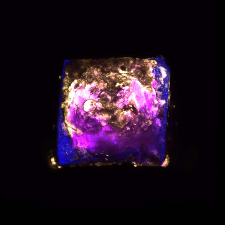 This is a 35 micron slice of a microparticle that was implanted under the skin of a mouse for one week before it was sectioned and imaged with a confocal microscope to study how the mouse’s immune system responded to it and whether there was any damage done to it. The microparticle was originally 300 x 300 x 100 microns, and it was constructed by a special microscale stamping, filling, and sealing process that was developed in the Langer Lab at MIT called SEAL (StampEd Assembly of Polymer Layers). It is an example of a “core shell” microparticle. The “shell” is comprised of a base and cap made of a biocompatible, biodegradable polymer called poly(lactic-co-glycolic) acid (PLGA). The hollow “core” of the microparticle can be filled with cargo such as vaccines or drugs. The microparticle is designed so that upon injection into the body, the PLGA will slowly degrade until eventually the cargo is released all at once. The time that it takes the polymer to degrade can be engineered to occur days, weeks, or even months after the microparticles are administered. Currently, these microparticles are being used to make single injection, self-boosting vaccines that can release their booster cargo at multiple timepoints in sequence many months after administration. They are also being used to deliver single injection, timed-release cancer therapeutics.