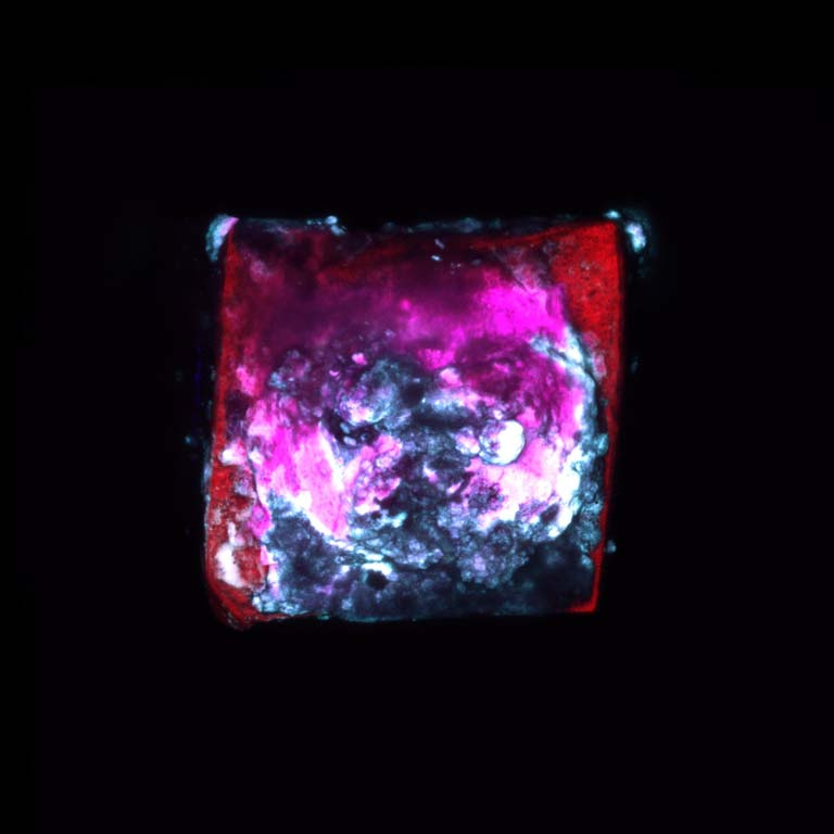 This is a 35 micron slice of a microparticle that was implanted under the skin of a mouse for one week before it was sectioned and imaged with a confocal microscope to study how the mouse’s immune system responded to it and whether there was any damage done to it. The microparticle was originally 300 x 300 x 100 microns, and it was constructed by a special microscale stamping, filling, and sealing process that was developed in the Langer Lab at MIT called SEAL (StampEd Assembly of Polymer Layers). It is an example of a “core shell” microparticle. The “shell” is comprised of a base and cap made of a biocompatible, biodegradable polymer called poly(lactic-co-glycolic) acid (PLGA). The hollow “core” of the microparticle can be filled with cargo such as vaccines or drugs. The microparticle is designed so that upon injection into the body, the PLGA will slowly degrade until eventually the cargo is released all at once. The time that it takes the polymer to degrade can be engineered to occur days, weeks, or even months after the microparticles are administered. Currently, these microparticles are being used to make single injection, self-boosting vaccines that can release their booster cargo at multiple timepoints in sequence many months after administration. They are also being used to deliver single injection, timed-release cancer therapeutics.