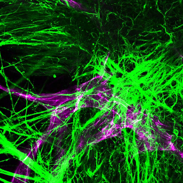 The 3D-miBRAIN-Chip is a vehicle for discovering what goes wrong in neurodegenerative disease and identifying and developing treatments to reverse those pathologies. This image shows engineered brain tissue with neurons and integrated vasculature and immune cells and the other support cells resident to the human brain.