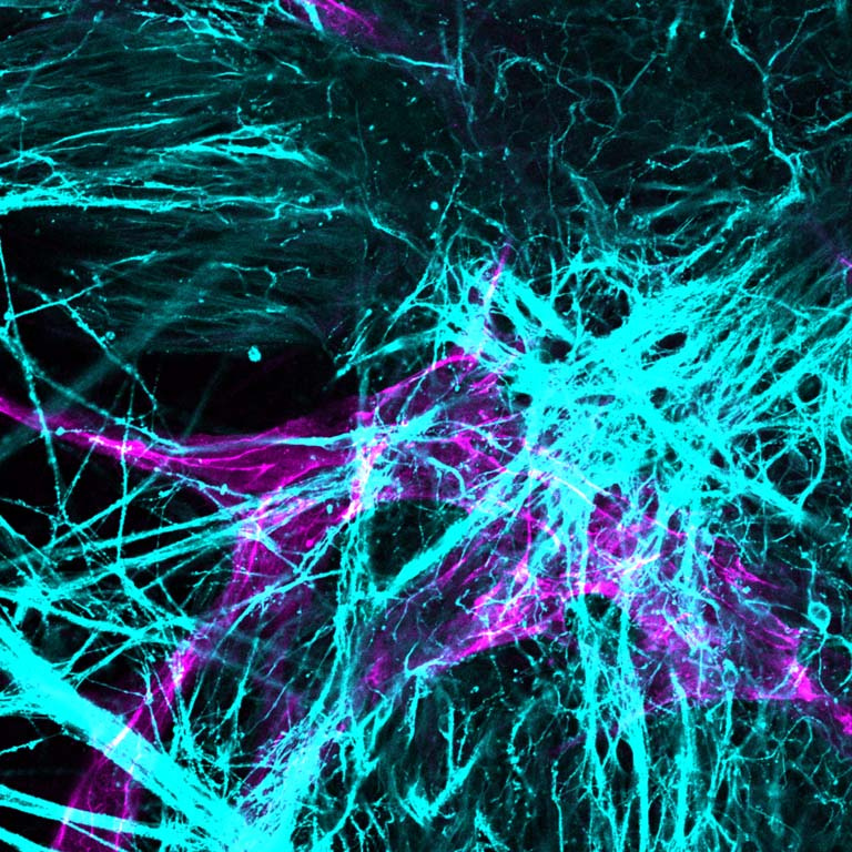 The 3D-miBRAIN-Chip is a vehicle for discovering what goes wrong in neurodegenerative disease and identifying and developing treatments to reverse those pathologies. This image shows engineered brain tissue with neurons and integrated vasculature and immune cells and the other support cells resident to the human brain.