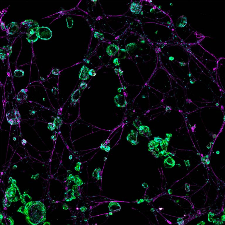 These images depict interactions between pancreatic cancer cells and sensory neurons. The pancreatic cancer cells are grown into 3D structures known as “organoids,” recapitulating the architecture of tumors in a dish. By culturing cancer cells and neurons together, we can observe their dynamic interactions—a collaboration that facilities tumor development, progression, metastasis, and therapeutic resistance across a broad range of cancers.