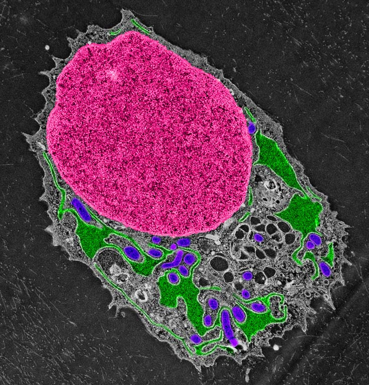 We are trying to understand what goes wrong in the cell in disease variants of precocious osteoarthritis (due to mutations in the gene encoding collagen-II). We are comparing these cells to a wild-type, healthy control. We were excited to see dilated endoplasmic reticula (highlighted in the color scheme) as a sign of pathology.