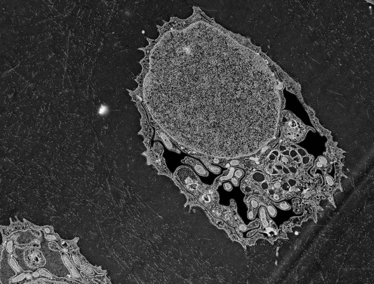 We are trying to understand what goes wrong in the cell in disease variants of precocious osteoarthritis (due to mutations in the gene encoding collagen-II). We are comparing these cells to a wild-type, healthy control. We were excited to see dilated endoplasmic reticula (highlighted in the color scheme) as a sign of pathology.
