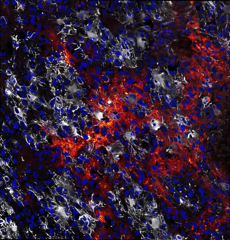 In this image, the nuclei of brain tumor cells are shown in blue, with the cell bodies of a subset of glial-like cancer cells shown in grey. The nanoparticles, shown in red, can be seen to travel a tortuous path through the dense cellular environment to maximize coverage of the tumor.