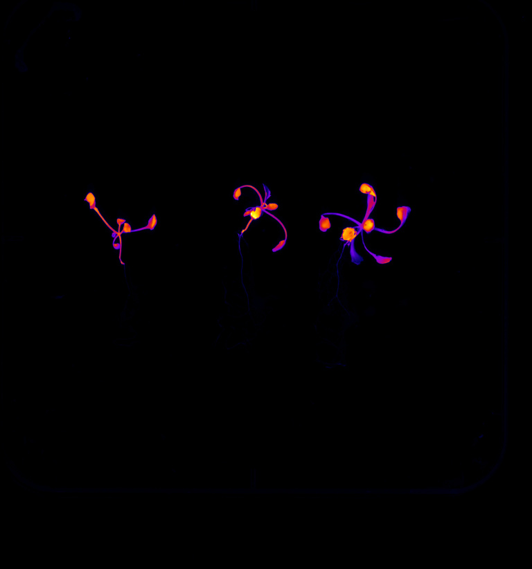 The image showcases Arabidopsis thaliana plants emitting a vibrant green glow in response to a distinct molecule produced by soil bacteria. This engineered interaction allows bacterial sentinels to detect specific soil signals, like nutrients, plant pathogens, or pollutants, and communicate their presence to the plants, effectively turning them into beacons for humans to detect these critical environmental cues.