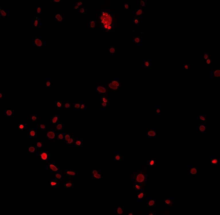 This image shows the heterogeneity of tumor cells that survive chemotherapy treatment. We were trying to see if cytoplasmic DNA or micronuclei were present in tumor cells surviving treatment with DNA-damaging chemotherapies. Indeed, micronuclei were present and some cells were multi-nucleated. Tumor cell size, shape, and nuclear integrity change upon treatment with chemotherapy, yet these cells remain alive.