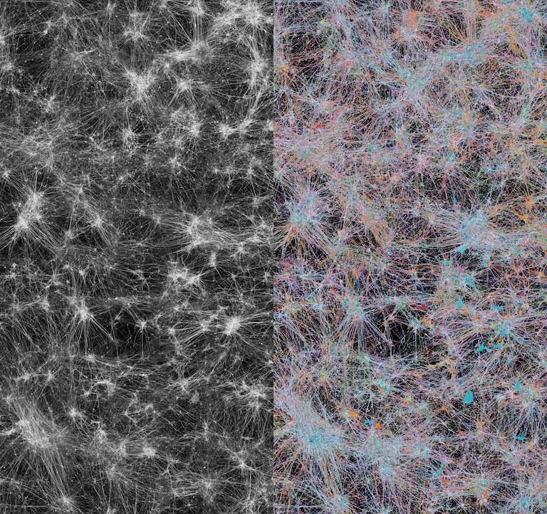 In the nervous system, neurons form complex networks, with thousands of connections within a small volume. Analyzing the structure of these complex network at a single-cell resolution is extremely challenging, as we lack methods to trace individual neurites accurately. We present both experimental and analytical framework to label individual neurons, allowing us to understand how various genetic factors influence neuronal structure. Left gray-scale image is a microscopy image of thousands of neurons, highly connected with each other and it is extremely difficult to trace them. Right hand side image is the result of computationally decoded image (segmented), where each color demonstrates individual neurons.
