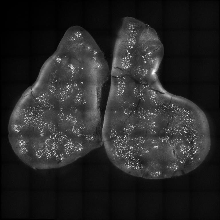 This is a microscopic image of an entire thymus. The thymus is stained for a new type of cell that we discovered called the thymic microfold cell, using a protein marker called GP2. The bright white dots in the image are the microfold cells.